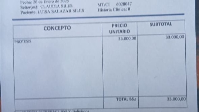 Całkowity koszt operacji, protezy i niezbędnych materiałów medycznych został oszacowany na 10,000 USD (około 70,000 boliwianos). Niestety, leczenie nie jest objęte boliwijskim systemem opieki zdrowotnej (SUS).