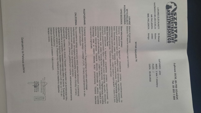 Wabię się Amigo(pewnie od razu wiedzieli, że będę bardzo towarzyski) i mam już ponad 2,5 roku! Wszystko szło idealnie w moim życiu: fajni właściciele, mieliśmy przytulne mieszkanie, a rok temu udało się przeprowadzić do domku, gdzie jest podwórko, na którym mogę się wybiegać. Mam dużo współlokatorów- są ze mną trzy psiaki z adopcji i chyba z 5 kotów(już sam się gubię, bo właściciele co chwila znajdują kogoś nowego na ulicy), z którymi w sumie też lubię się bawić. I tak sobie żyliśmy w spokoju, z mniejszymi, lub większymi przygodami, czy wizytami u „weta”, dopóki nie zdarzył się mały wypadek…. Miałem atak padaczki, a później w niedługim czasie kolejny. Ja to się w sumie tak nie zestresowałem i tego nie pamietam, ale moi właściciele się uparli i zabrali na jakieś badania. Padaczka genetyczna, jak się okazało jest najmniejszym problemem. Pamiętacie podwórko, o którym mówiłem? Mogę już na nim długo nie pobiegać…. Pomimo młodego wieku stwierdzono dysplazję stawów łokciowych i konieczna będzie operacja. Wiem, że czasy dzisiaj są ciężkie, ale chciałbym móc dożyć z moimi właścicielami i zwierzęcymi przyjaciółmi tych lepszych. Nie chcę by musieli się szybko ze mną żegnać- w końcu dopiero 2,5 roku się znamy! Będę wdzięczny za każdy grosz, bo to on przybliży nas do sfinansowania mojej operacji!