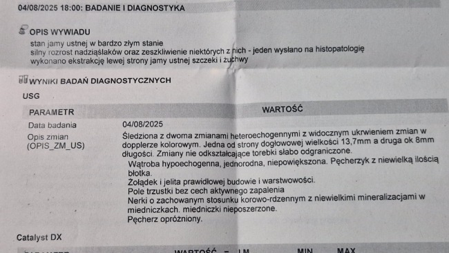 Niedawno przyszły wyniki histopatologii - zdiagnozowano u niej nowotwór o niskiej złośliwości (nadziąślak).
