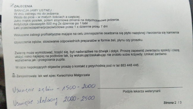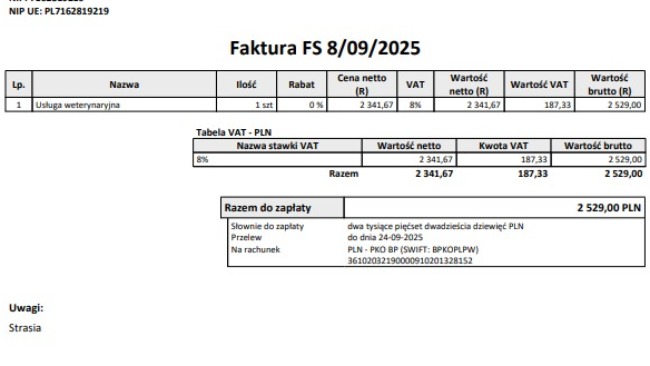 Strasia czeka jeszcze na dwa zabiegi - usunięcie zębów z drugiej strony szczęki i usunięcie śledziony , ale aby to było możliwe, najpierw musimy uregulować płatność za wcześniejszą diagnostykę oraz zabieg usunięcia zmiany na dziąśle i zębów. Kwota Faktury do zapłaty - 2529 zł