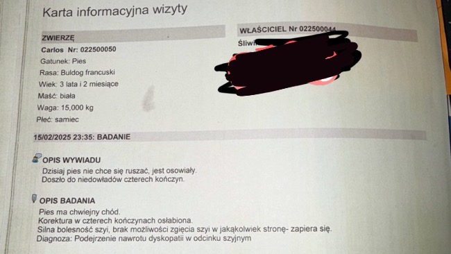 WITAM PILNIE POTRZEBUJEMY WASZEJ POMOCY!!! LICZY SIĘ KAŻDA ZŁOTÓWKA. Zbieramy na już drugą operację dysku naszego kochanego carloska, nasz pupil ma dopiero 4 lata a już niestety przecierpiał bardzo dużo. Pierwsza operacje miał niecały miesiąc temu, ledwo co zaczął dochodzić do siebie i nagle znacznie mu się pogorszyło. Prawdopodobnie bedzie potrzebna druga taka operacja. Carlos to członek naszej rodziny więc spróbujemy wszystkiego by zawalczyć o jego życie. Z góry dziękujemy za każdą wpłatę. Mamy całą ważną dokumentację. Niestety mamy bardzo mało czasu..