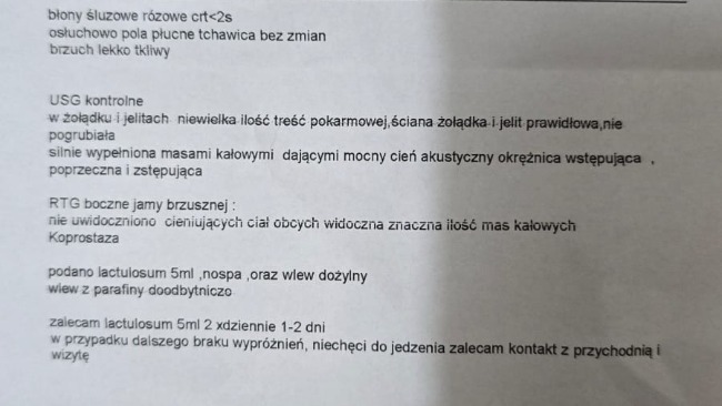 Na szczęście Włodek jest już pod dobrą opieką i nic nie zagraża jego życiu! Przeszedł kompleksowe badania – morfologię, USG, RTG – oraz otrzymał leki i nawadnianie przez kroplówkę. Potrzebna była także delikatna lewatywa, by pomóc mu poczuć się lepiej.