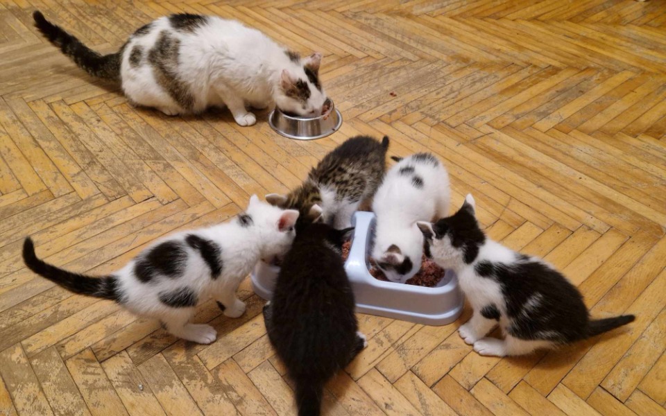 Mama, która bezpieczne miejsce do urodzenia maluchów znalazła na drzewie. Maluchów cała piątka. Mają obecnie 5/6 tyg. Są po pierwszym odrobaczaniu. Rozwijają się prawidłowo.
