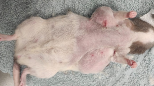 Rzeczywistość. Trzy zawszone szczurzynki. Wszystkie z guzami na ciele. Ta 'zdrowa' ma guz przysadki. Dwie z nich mają zapalenie uszu.