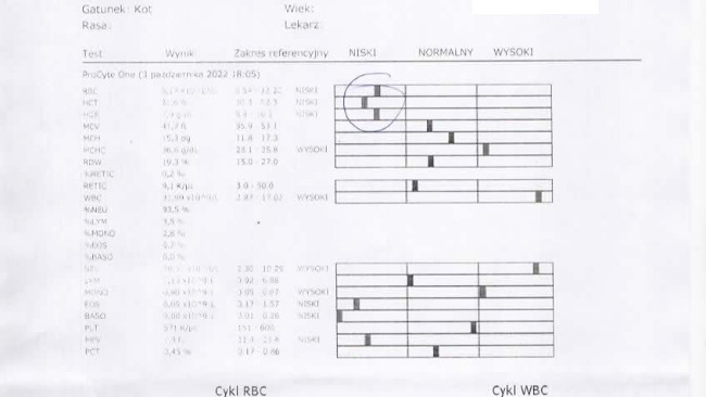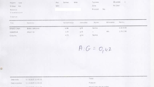 Po serii badań okazało się, że to FIP – kocia choroba, która jeszcze do niedawna była wyrokiem śmierci. Badanie krwi wykazało stosunek A:G 0,47, a USG potwierdziło obecność płynu w jamie brzusznej. Dodatkowo występowała gorączka, która znikała tylko na chwilę, by po kilku godzinach znów wrócić. W ciągu kilku dni schudła prawie 0,5 kilograma – ponad 10% swojej masy ciała.