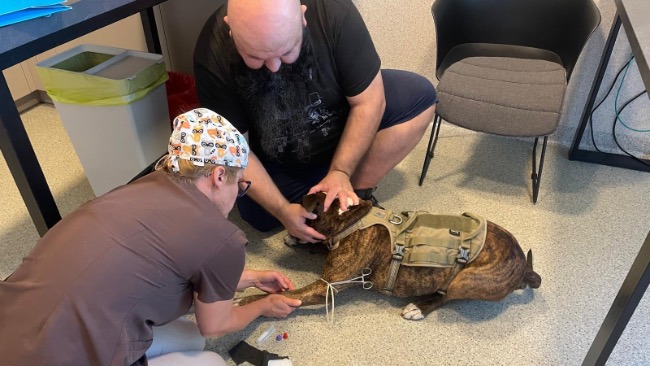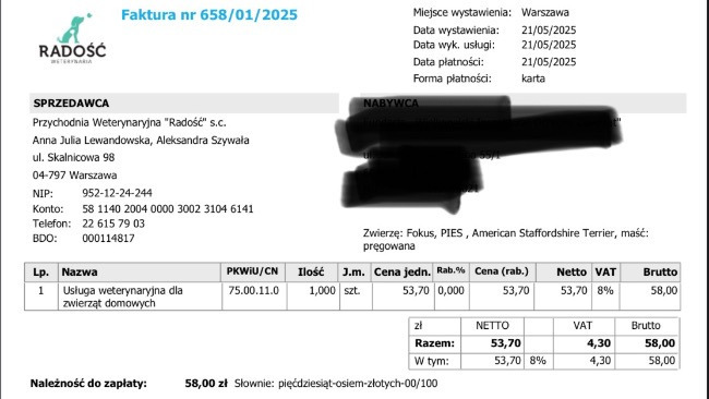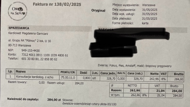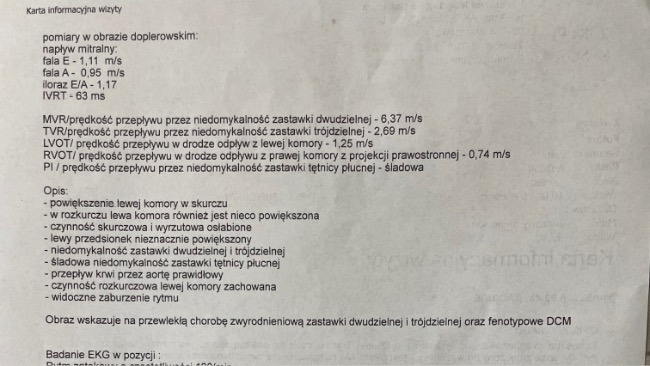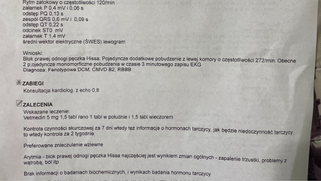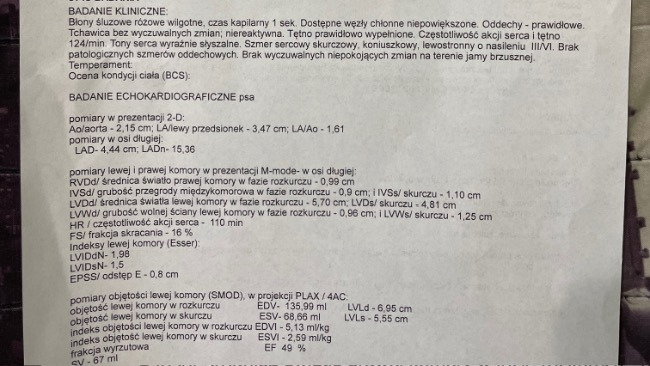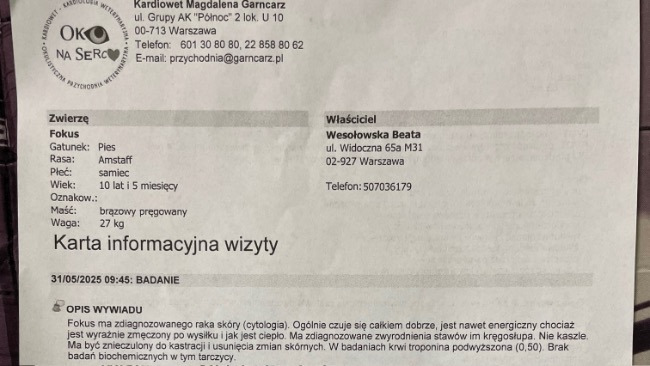 Edit. 2025-05-12: wizyta kontrolna. Wg zaleceń kardiologa zbadano krew: morfologia + CRP + troponina. Nasz chłopak ma liczne zmiany na skórze, dlatego pobrano również cytologię. Niestety lata zaniedbań przez byłego właściciela ukazują się nam w poniższym opisie:* znacznie powiększona prostata z licznymi torbielami,* jądro prawe zmienione - konieczny zabieg kastracji,* złamany kieł po stronie prawej, podejrzenie ropni - prawdopodobnie trzonowce do usunięcia,* Zmieniona śledziona - do kontroli za miesiąc. Dalsze zalecenia to: konieczny zabieg stomatologiczny i kastracja, USG, rtg kręgosłupa oraz kończyn, wprowadzenie leków poprawiających chodzenie, dobranie leków p/ bólowych i p/ zapalnych.