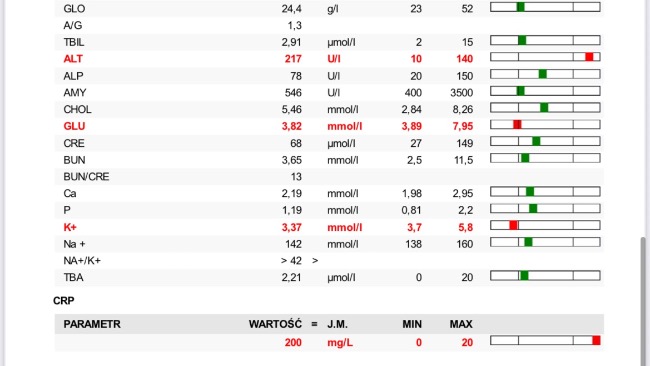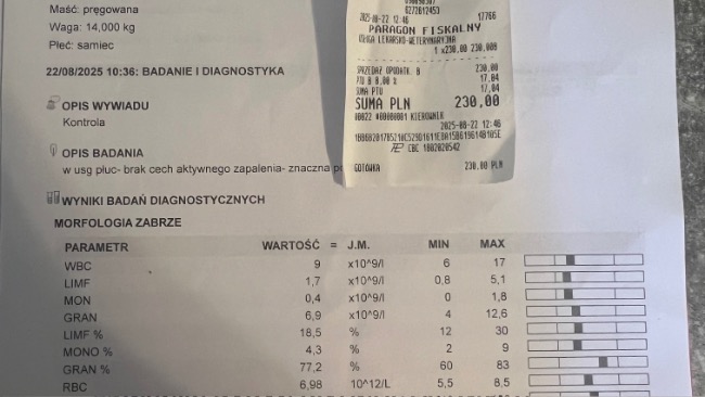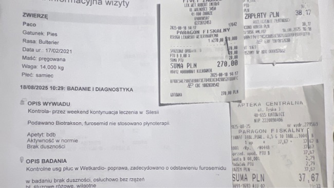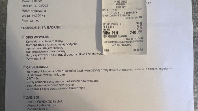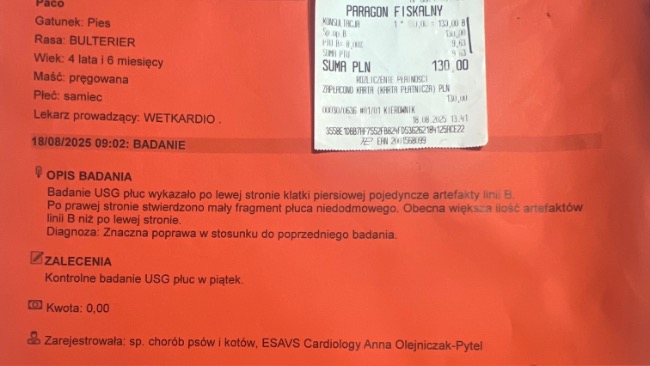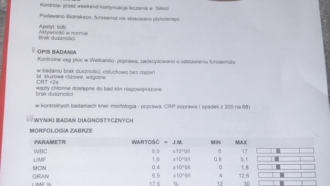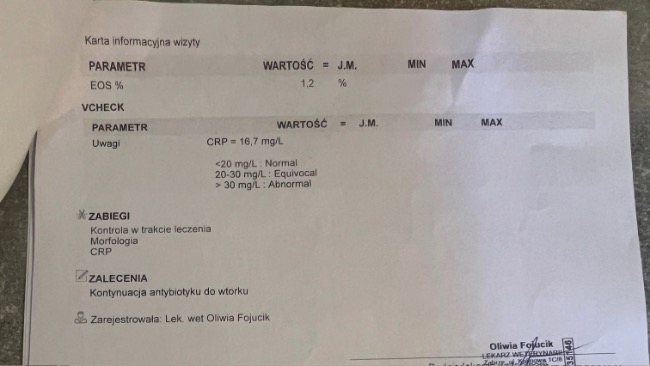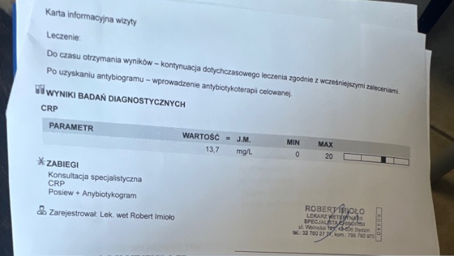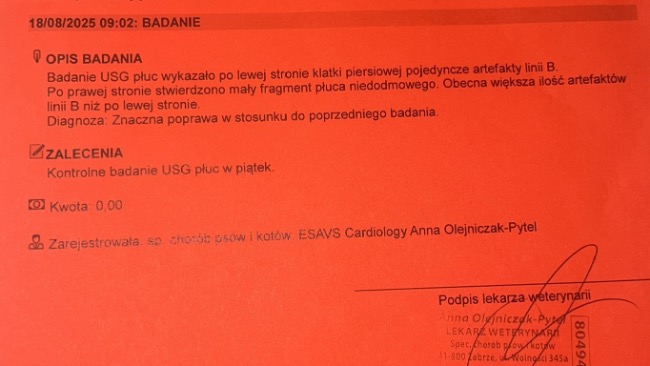 Crp z 200 spadło na 68, temp . się unormowała . Nadal Paco jest na antybiotyku i na tlenoterapii . Apetyt zaczął dopisywać ale płyn w płucach jeszcze jest . Dodatkowo żeby wzmocnić paco zaczął jeździć na akupunkturę. Kolejna wizyta w klinice wetkardio i fivet 22.08.25 , akupunktura w fizjo-wet 23.08.25