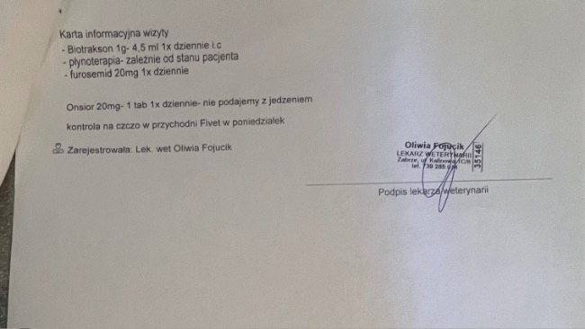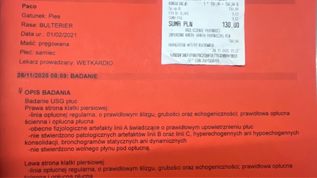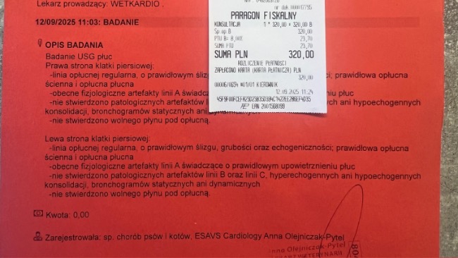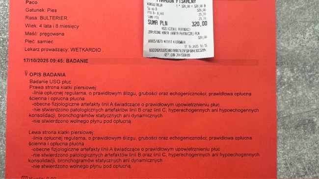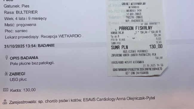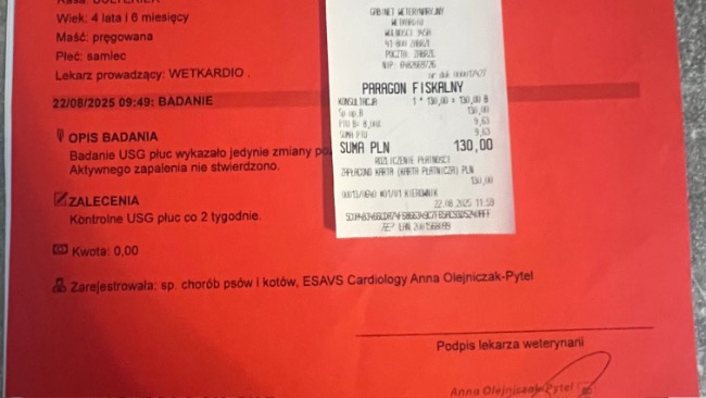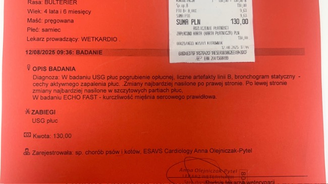 Wizyta w Wetkardio, by sprawdzić serduszko i płuca. Na szczęście nie wykryto wolnego płynu pod opłucną . Ze względu na pogorszone samopoczucie Paco, podano mu lek przeciwzapalny. Za tydzień 12.09.25 czeka Nas kolejna kontrola .