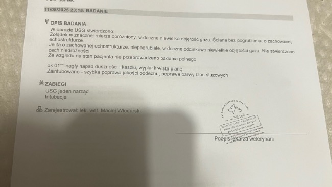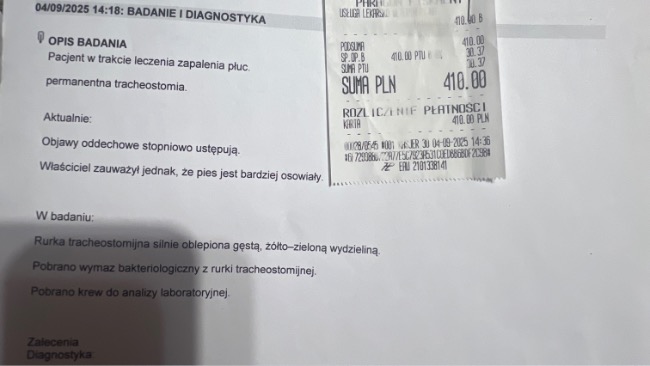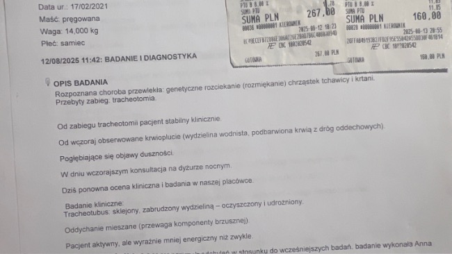 Stan Paco jest bardzo ciężki . W dniu 11.08.25 Paco zaczął się dusić -ledwo został odratowany . Spędził noc w klinice całodobowej . Rano 12.08.25 został Paco przewieziony do Zabrza do kliniki wetkardio i fivet gdzie stwierdzono zapalnie płuc i powikłania po tracheotomii. Spędził tam cały dzień pod kroplówką , tlenem a także dostał antybiotyk . Po powrocie do domu Paco zwymiotował krwią i żółcią i ponownie jechalalam do kliniki całodobowej . Kolejną noc pod tlenem