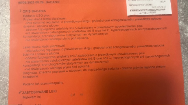 CRP wróciło do normy , USG płuc wykazały jedynie zmiany pozapalne. Aktywnego zapalania nie stwierdzono . Dalej antybiotyk , probiotyk ,tlenoterapia (w domu ) akupunktura 2x w tygodniu i do końca roku co 2tygodnie USG . Kolejna wizyta 05.09.25