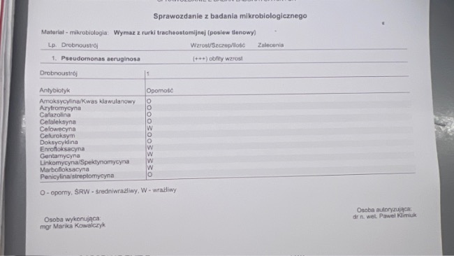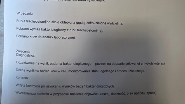 Za jakiś czas zostanie ponownie pobrany wymaz z rurki tracheostomijnej, aby sprawdzić, czy leczenie przynosi efekty i czy udało się opanować bakterie.