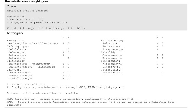 Po 7 sesjach ozonowania Paco będzie miał wykonane kontrolne badanie, które pokaże, czy udało się pokonać pałeczkę ropy błękitnej (Pseudomonas aeruginosa).