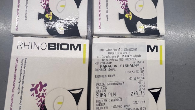 W drodze do Oświęcimia udało mi się zdobyć w jednej z klinik zalecany przez dr R. Imiolo RHINOBIOM z firmy Antibiom – tak, żeby bakterie się nie rozprzestrzeniły.