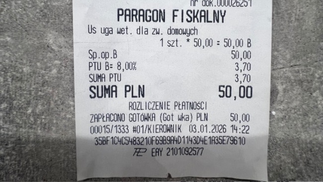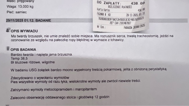 Wizyta była konieczna m.in. dlatego, że Paco ma wszczepiony rozrusznik, stałą tracheostomię i niedawno przechodził ozonoterapię z powodu pałeczki ropy błękitnej znalezionej w wymazie z tchawicy — w jego przypadku nawet pozornie „zwykłe” wymioty mogą szybko stać się groźne.