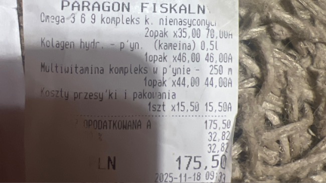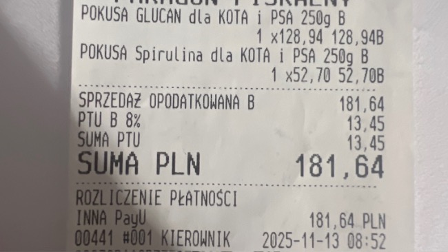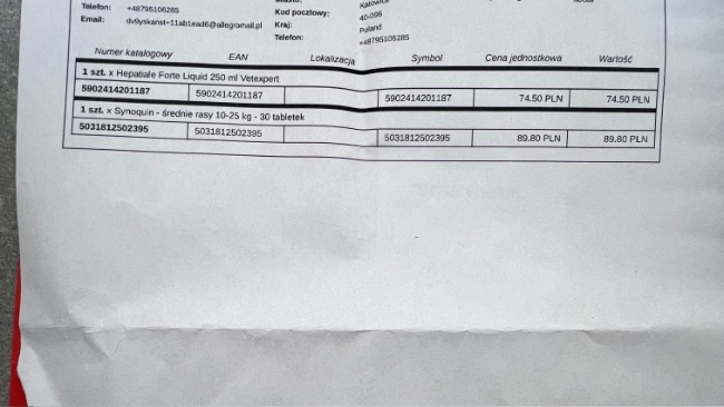 Został zamówiony glukan i spirulina dla Paco, aby wzmocnić jego odporność i pomóc organizmowi w walce z infekcjami.