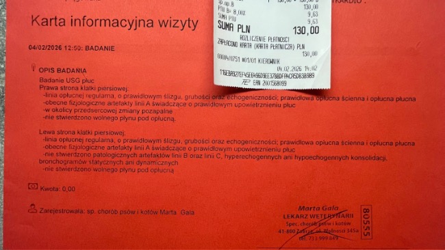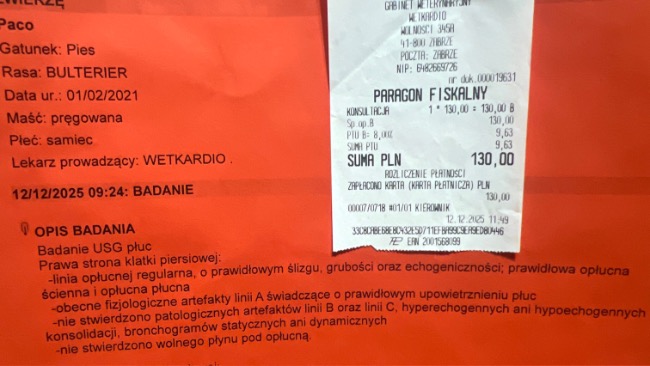 Na kontrolach w Wetkardio widoczna jest stopniowa poprawa płuc, jednak po prawej stronie nadal utrzymują się lokalne zmiany. Antybiotyk został przedłużony do piątku, wtedy zapadnie decyzja, czy leczenie będzie kontynuowane. Cały czas musimy bardzo uważać, aby nie doszło ponownie do zachłystowego zapalenia płuc — ostatnim razem Paco ledwo udało się uratować.