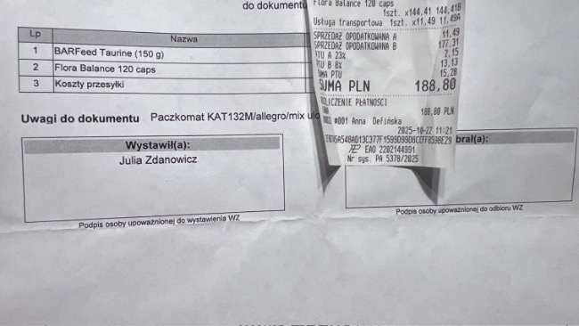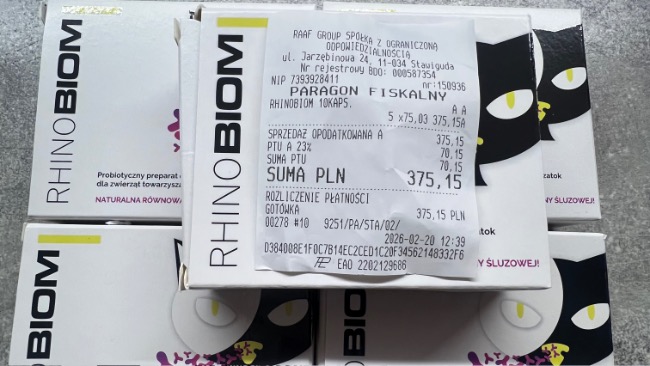 Został zamówiony RhinoBIOM z firmy AniBiom to specjalistyczny, probiotyczny preparat przeznaczony do pielęgnacji nosa i zatok. Wspiera naturalną mikroflorę błony śluzowej, pomagając w łagodzeniu podrażnień, infekcji bakteryjnych/wirusowych oraz problemów z nadmierną wydzieliną