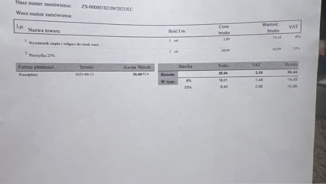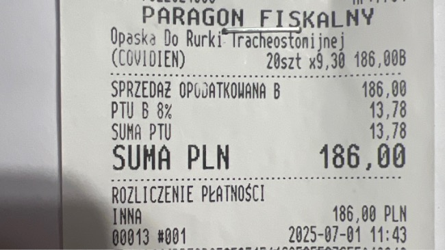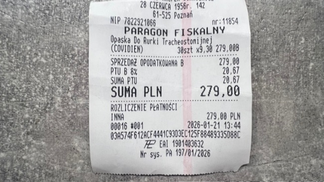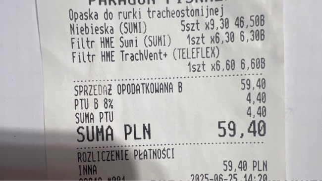 W dniu dzisiejszym zostały zamówione opaski do rurki tracheostomijnej a także wymiennik ciepła czy filtr .