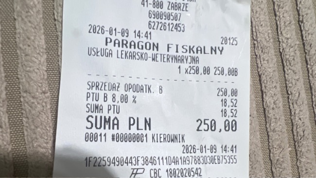 09.01.26 Paco ma kontrolę płuc w Wetkardio w Zabrzu . Po 7 sesjach ozonowania w klinice Krzysztofa Klimas zostanie też pobrany wymaz z rurki tracheostomijnej, aby sprawdzić, czy udało się zwalczyć pałeczkę ropy błękitnej.
