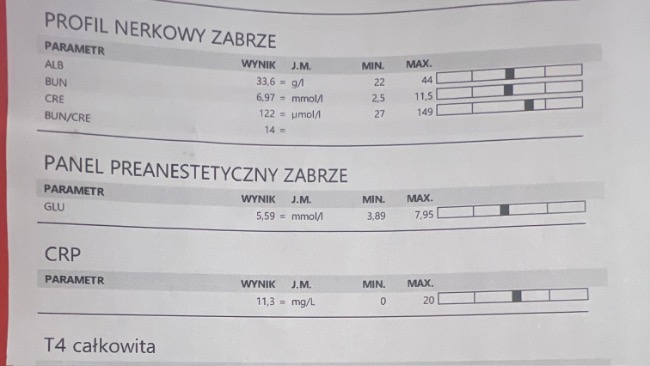 W poniedziałek Paco miał wykonane badania krwi w klinice w Zabrzu. Dzisiaj otrzymałam wyniki – stwierdzono anemię. Paco otrzymał leki i za 2 tygodnie planowane jest ponowne pobranie krwi w celu kontroli parametrów.