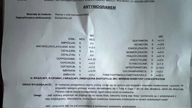 Tego samego dnia w klinice Fivet w Zabrzu pobrano również wymaz z rurki tracheostomijnej, aby sprawdzić, czy udało się pozbyć się groźnej bakterii – pałeczki ropy błękitnej. Wynik tego badania zdecyduje o dalszym leczeniu.