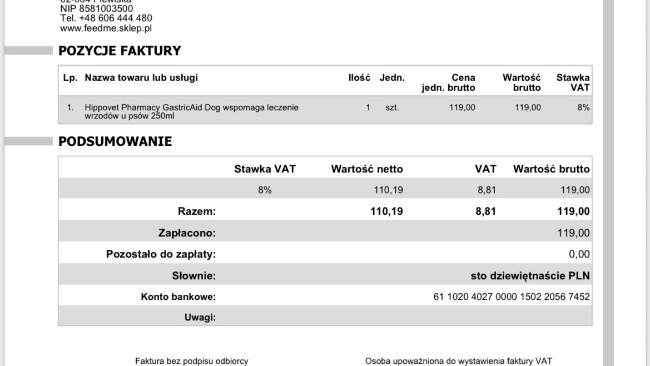 Ze względu na podejrzenie zapalenia żołądka, refluksu zalecono Hippovet Pharmacy GastricAid Dog .