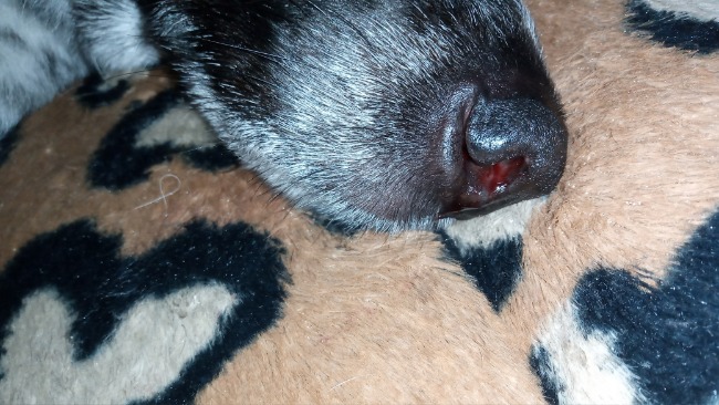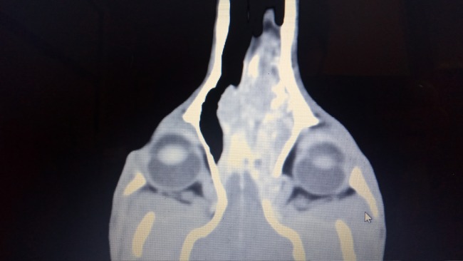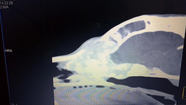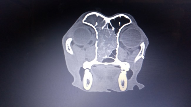 Ogi kichał od początku. Kichał strasznie. Z noska wyciekały mu gluty we wszystkich kolorach - od białych, żółtych, zielonych po brunatne. Aż zaczął kichać krwią. Próbowaliśmy go leczyć antybiotykami, sterydami, robiliśmy posiewy, był na zabiegu rinoskopii, który nic nie wykazał. Zdecydowaliśmy się na tomografię komputerową, która niestety pokazała nam ogromną zmianę. Nowotwór zajmuje prawie całą przestrzeń w nosie, przebija się do mózgu i gałek ocznych. Zniszczył też kość między oczami do tego stopnia, że pojawił się tam odstający guz.
