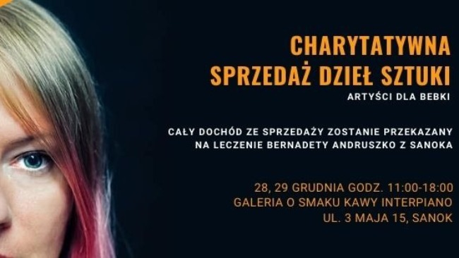 28 i 29 grudnia organizujemy Charytatywną Sprzedaż Dzieł Sztuki w kawiarni Interpiano w Sanoku (ul. 3 Maja 15). Podczas tych dwóch dni Galeria o smaku kawy wypełni się obrazami, biżuterią i rękodziełem, a pieniądze z ich sprzedaży zostaną w całości przeznaczone na pomoc dla Bernadety. Razem możemy pomóc Bebce w walce z chorobą i jej konsekwencjami. Liczymy na Wasze wsparcie – każda praca, każda złotówka ma ogromne znaczenie!