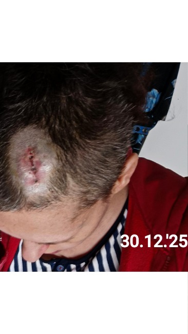 Zima, wiosna, lato będę chodzić w czapce, chustce.Mam równo ogoloną połowę głowy, nie dało się inaczej gdyż jedna dziura w czaszce jest nad czołem a druga nad uchem.