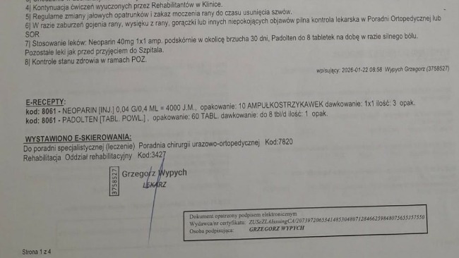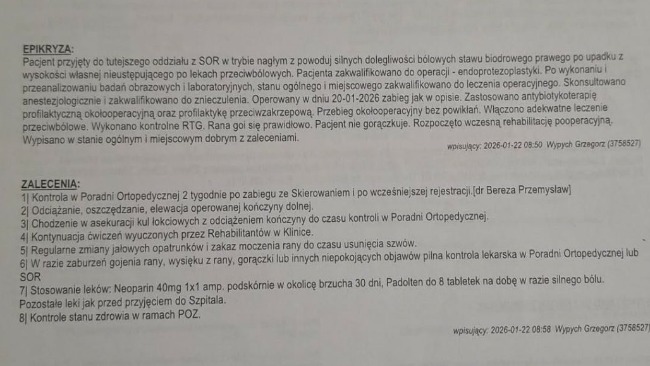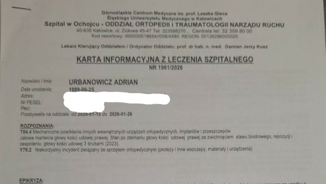 20 stycznia 2026 roku przeszedłem poważną operację – endoprotezoplastykę biodra. Mój staw biodrowy został wymieniony na sztuczny. Niestety do dziś nie otrzymałem potrzebnej rehabilitacji z NFZ, a bez niej nie jestem w stanie normalnie chodzić. Od 3 lat poruszam się o kulach.