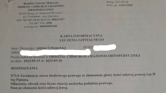 W stanie krytycznym zostałem przetransportowany do szpitala. W jego wyniku doznałem bardzo poważnego urazu – złamania głowy kości udowej prawej typ II wg Pipkina, przeszedłem pilną operację wstawienia 3 śrub zespalających złamana kość udową. Od tamtej chwili nic już nie jest takie samo. W jednej sekundzie straciłem zdrowie, stabilność finansową, swoje pasje i plany na przyszłość.