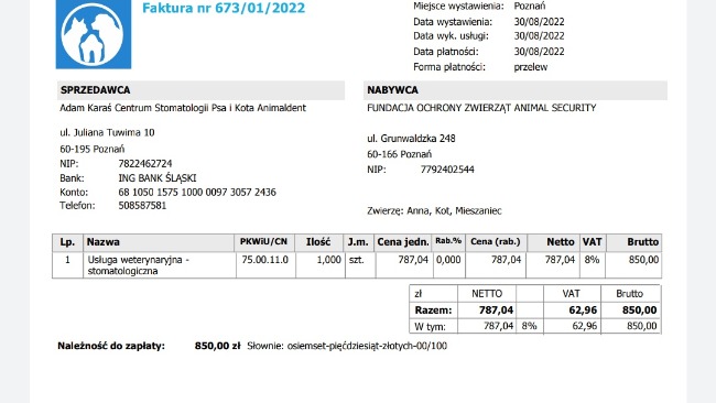 Anna to starsza kotka znaleziona w stanie skrajnego wycieńczenia nad jednym z podpoznańskich jezior. Chuda, brudna, z ropą lejącą sie z gardła, nosa. Doprowadzenie jej do zdrowia kosztowało nas dużo pieniędzy i czasu. Teraz gdy juz jest ustabilizowana czas zająć się jej zębami a raczej tym, co zostało w pyszczku- ogromny kamień utrudniający jedzenie i powodujący duży ślinotok, połamane zęby, zepsute korzenie. Kotka cierpi a brak funduszy sprawia, że odkładamy wizyte u stomatologa.....ale dlaczego ona ma cierpieć nadal??? Błagamy- pomóżcie nam i Annie !