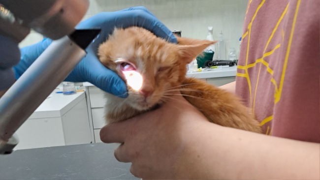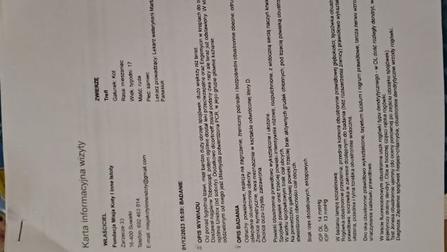 Zaczęło się od łzawienia prawego oczka. Pierwsze krople nie pomagały. Następnie drugie oczko spuchło i zaczęło łzawić. Został włączony ogólny antybiotyk - doksycyklina oraz engemicin do oczu.