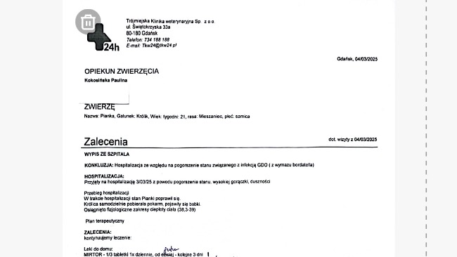 Historia zaczęła się od zabrania do domu dwóch królików, z miejsca w którym nie miały najlepszych warunków. Chcieliśmy po prostu dać im lepsze życie. W maju 2024 zaczęliśmy walkę o zdrowie szarej króliczki, po wielu zabiegach w tym ostatecznie usunięciu oczka, przegraliśmy tę walkę w grudniu. Cookie (brązowa króliczka) została sama i smutna dlatego zdecydowaliśmy się adoptować dla niej kolejną dziewczynkę. Wszystko było dobrze do czasu aż u małej pojawiło się wiele pasożytów i nieznanego pochodzenia katar, który wymaga wielu wizyt u weterynarzy, antybiotyków, badań tomograficznych i rinoskopii. Są to niestety wielkie koszty ale do tej pory dawaliśmy radę z nadzieją, że ta seria niefortunnych zdarzeń w końcu się skończy.