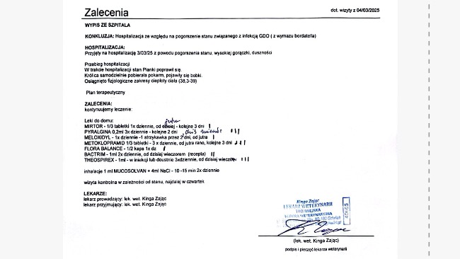 Podczas hospitalizacji Cookie stan Pianki bardzo się pogorszył przez bakterie i także musiała zostać hospitalizowana. Została pod tlenem i kroplówkami dlatego udało się ją ustabilizować ale dalej jest na silnych lekach. Cookie przeszła dwa przetoczenia krwi i dopiero to drugie trochę pomogło. Teraz dostaje leki, które mają wspomóc szpik kostny w działaniu i w dalszym ciągu wierzymy, że to pomoże.