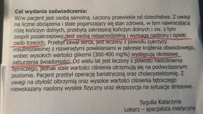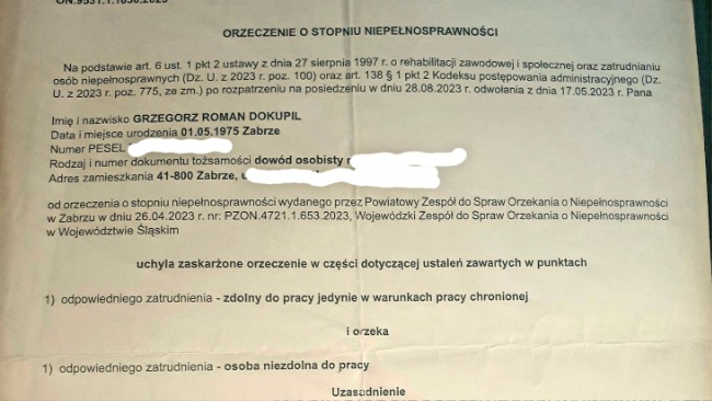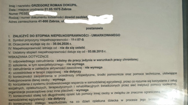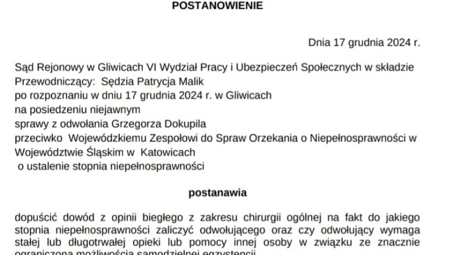 Z uwagi że Powiatowy Zespół do Spraw Niepełnosprawności "ozdrowił" mnie i odwoływałem się do Wojewódzkiego Zespołu do Spraw Niepełnosprawności gdzie dano mi całkowitą niezdolność do pracy utrzymując jednak stopień niepełnosprawności umiarkowany co skutkowało odwołaniem się do Sądu Pracy i Ubezpieczeń Społecznych w Gliwicach gdzie sprawa trwa już półtora roku byłem trzy razy badany przez lekarzy biegłych kardiologa i internistę a w grudniu powołano następnego biegłego chirurga więc orzeczenie o niepełnosprawności jest nadal nieprawomocne a sprawa jest nadal w toku.