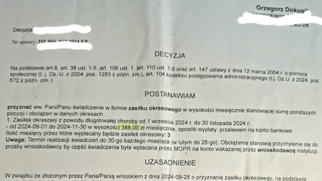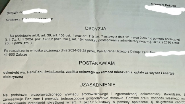 Wobec takiego stanu rzeczy nie przysługuje mi zasiłek stały i utrzymuje się w chwili obecnej zasiłku okresowego z MOPRu w kwocie 388 zł !!! Co drugi trzeci miesiąc otrzymam ewentualnie 200 zł na żywność a w listopadzie otrzymałem 500 zł na opał który już mi się kończy.