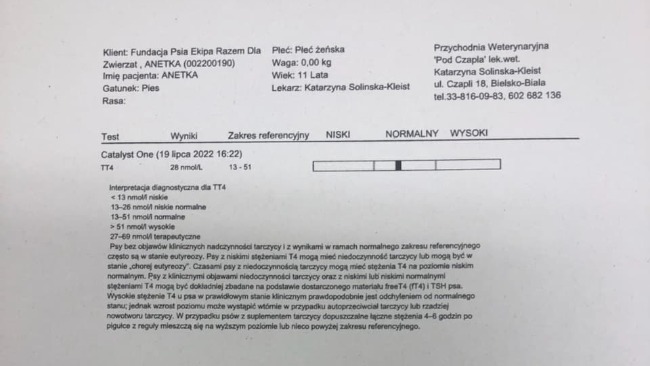 Anetka ma około 10 lat. Pod naszymi skrzydłami jest pod stałą opieką weterynaryjną. Wykonaliśmy w jej przypadku pełne badania krwi (morfologia, biochemia, tarczyca), które powtarzamy, aby kontrolować stan jej nerek, bo obecnie z tym się zmagamy. Czeka nas więcej jak np. sanacja jamy ustnej czy usg.