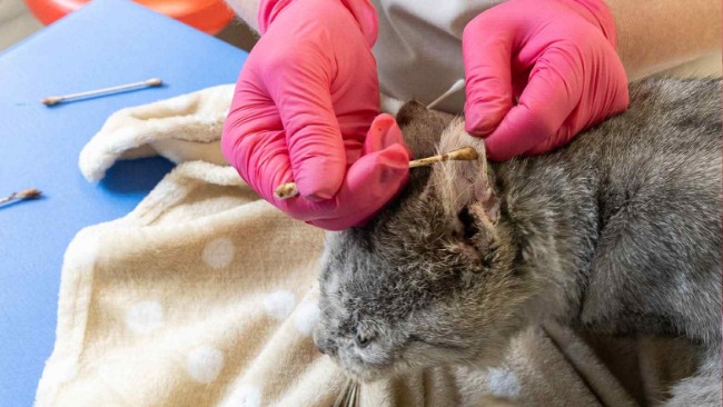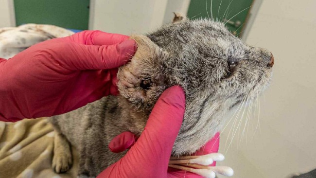 Ostry stan zapalny uszu, braki w uzębieniu i ogromny ból w pyszczku, rany po pogryzieniach i ślady po długim życiu na wolności...