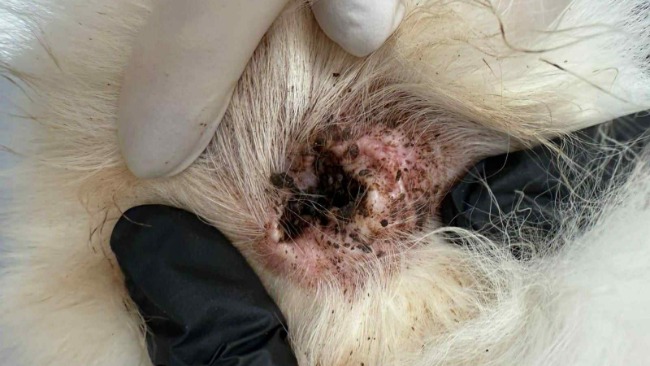 Stan zapalny w uszach bakteryjno-grzybiczy. Wdrożyliśmy leczenie: antybiotyk oraz codzienną toaletę uszu, by zmniejszyć ból i świąd.