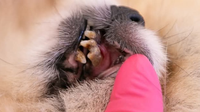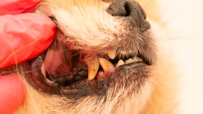 Jej pyszczek to obraz bólu. Zęby są w stanie dramatycznym. Paradontoza, zapalenie dziąseł, ogromne ilości kamienia. Zapach rozkładu czuć z daleka. Ona żyje z tym bólem każdego dnia.