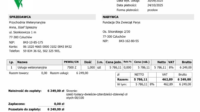 Co miesiąc otrzymujemy fakturę za leczenie kotów, które przyjęliśmy do kociego szpitala prowadzonego przez fundację charytatywnie.