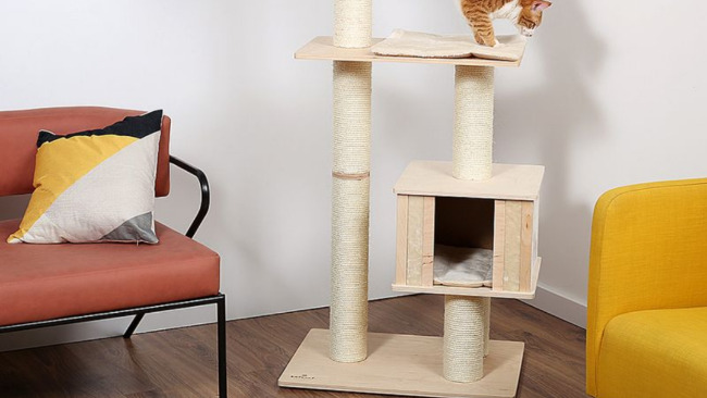 Jest to solidny drapak, niewymyślny, prosty, ale stabilny i z trzema piętrami. Koty bardzo chętnie śpią na najwyższych legowiskach, a w tym momencie mamy tylko 2 drapaki, które są na tyle wysokie, aby koty mogły oglądać dom z góry.