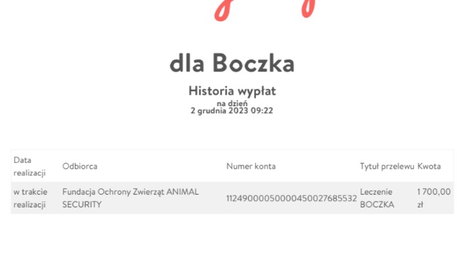 Kochani. Zebraliśmy 1.700.00 zł, które w dniu dzisiejszym przekazałam fundacji na Boczka. Dziękuję wszystkim za wsparcie i dobre serca.Jeżeli ktoś chciałby nadal pomóc i wpłacić na leczenie, zbiórka nadal otwarta.