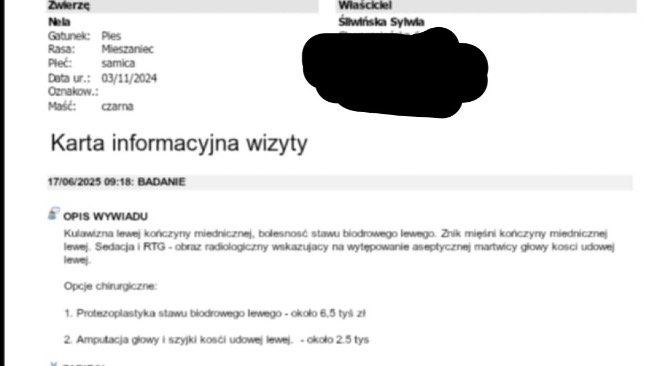 Dzień dobry nasz ukochany piesek NELA ma dopiero 7 miesięcy na początku było wszystko okej jednak jak miała 4-5 miesięcy zaczęła utykać na łapkę poszliśmy więc do lekarza okazało się że umiera jej mięsień w łapce i trzeba to jak najszybciej operować niestety nie mamy takich funduszy bardzo prosimy o wsparcie.