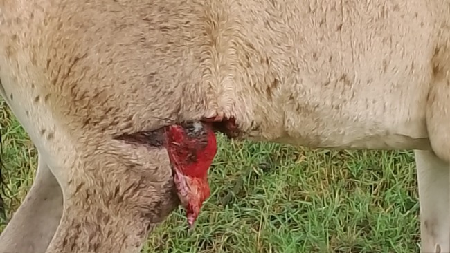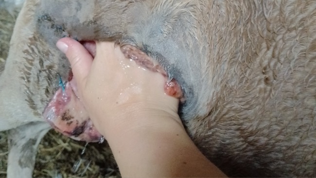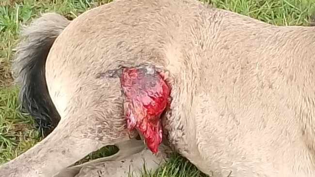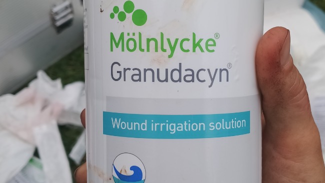 Niestety ranę trzeba dokładnie myć każdy zakamarek. Niestety tak głębokie są uszkodzenia skóry. Przemywanie Manusanem i psikanie preparatami weteraryjnymi. Które polecił weterynarz.