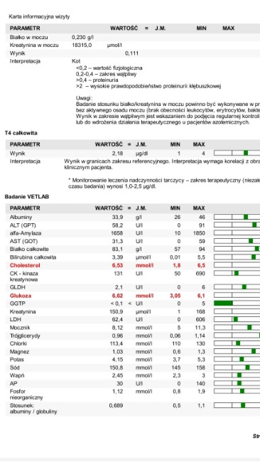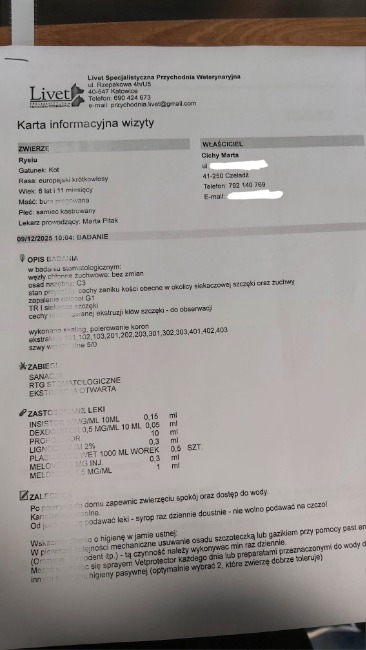 Jest też szansa, że wszystkie te niepokojące zachowania spowodowane są traumami i lękami jakie Rysiu ma w sobie po bardzo trudnym życiu ulicznym, jeszcze wtedy jako kot wolnożyjący przy ul. Ogrodowej (dlatego została mu zalecona na wyciszenie i odstresowanie gabapentyna którą ma mieć podawaną na razie codziennie). Ale większe szanse są jednak na to, że to z bólu bo w końcu on p. Anię uwielbia, czuje się przy niej totalnie swobodnie i jako jedynemu człowiekowi na tym świecie w 200 % ufa. Dlatego musimy wykluczyć wszystko co się da i zostały już tylko te zęby. Wszystkie wykonane na wizycie badania wyszły dobrze (krwi, moczu, usg jamy brzusznej).