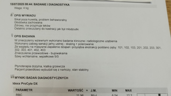 Natomiast na resztę kociego świata, reaguje potężnym stresem. Z uwagi na jego właściwości osobiste, Locik ma w domu swoje osobiste strefy, by zoptymalizować komfort jego funkcjonowania. Eliot pozostaje cały czas w opiece weterynaryjnej, z uwagi na częste komplikacje behawioralne. Natomiast teraz pojawiły się dość znaczne kłopoty z uzębieniem. Zauważyliśmy, że Locik, przy całej swej "delikatności" stał się jeszcze bardziej rozdrażniony, zaczął załatwiać się poza kuwetą, znaczył też teren moczem. Badania moczu miał dobre, więc wykluczono stan zapalny w obrębie dróg moczowych, natomiast podczas wizyty lekarskiej w pyszczku zaobserwowano masywny stan zapalny . Interwencja stomatologiczna okazała się bardzo pilna. Błyskawicznie umówiliśmy termin zabiegu stomatologicznego i 15.07 taki zabieg się odbył.