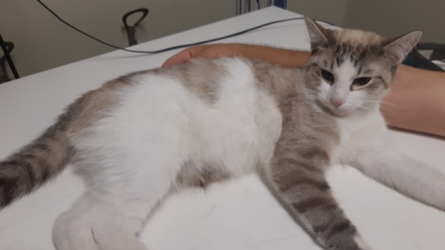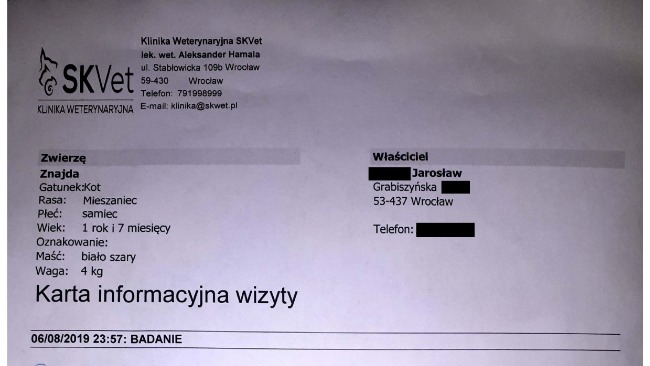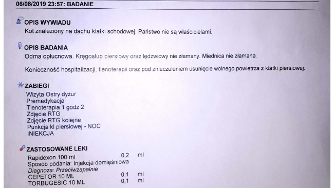 Wczoraj ok. godz. 23:00 wchodząc do klatki usłyszeliśmy miauczenie. Okazało się, że na dachu klatki schodowej przy ulicy Grabiszyńskiej siedzi w dziwnej pozycji kot. Udało się go stamtąd ściągnąć, kot miał problemy z chodzeniem i oddychaniem, powłóczył tylnymi nogami. Pierwsza diagnoza- wypadł komuś z balkonu. Zabraliśmy kota do kliniki weterynaryjnej SKVet na Stabłowicach. Po wykonaniu zdjęć RTG weterynarz nie stwierdził złamania kręgosłupa ani miednicy, stwierdził odmę opłucnową i problem z ostatnim kręgiem kręgosłupa (za mała przerwa pomiędzy kręgami). W nocy pod znieczuleniem wykonano kotu ściąganie odmy, podano tlen w inkubatorze, dzisiaj będzie dokładniej diagnozowany problem z tylnymi łapami. Kot jest zadbanym, kastrowanym samcem, wiek ok. 1 rok. Po obejściu całego bloku nikt się do kota nie przyznał, a rachunek rośnie... Na dzień wizyty o 23:57 wyniósł już 415 zł, do tego dojdą dzisiejsze badania. Bardzo prosimy o pomoc w opłacie hospitalizacji, nie mogliśmy zostawić tej bidy...