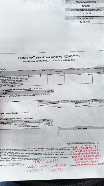 Niestety nie udało się w tym terminie wstawić okna na klatce schodowej, będzie ono wstawione w terminie do 3 tygodni, a jego koszt to 1490 zł.
